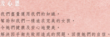 | 無論醫學美容,整型手術及自然療法,我們都喜歡研究嘗試,這麼多年過去客人形容我們已經成為一本活的整型字典,我們亦盡量運用我們的知識,幫助和我們一樣追求完美的女孩,令她們健康及安心地變美,以及解決因手術失敗而造成的各種問題,回復她們的自信,這樣除了令我們很有成就感以外,汝心思亦是一個令我們收集到很多友誼的地方。