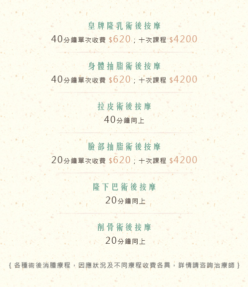 | 擁有自然療法背景及熱衷於美學的我們,均從事醫學美容多年,最初由於我們的客人都是對美感上要求較為極致的一群,其中不乏藝員模特兒,他們也可以說得上是醫學美容開始盛行起來最初嘗試的第一撮人,為了滿足客人的需求,當時還是經營美容院的我們多年前已經開始研究各種療法幫助客人增加手術成功率,解決他們於整容手術後出現的各種的不適,有時候客人回診的時候,醫生也驚訝,為什麼個案可以恢復得如此的好,我們就是被這種成就感和喜悅一步一步引領我們走進這個行業。 2008年於香港成立首間術後按摩護理專門店。其後我們亦繼續研究世界各地不同醫生的各種手術效果,時刻保持深造學習,緊貼醫學潮流,關心客戶需要,聆聽他們的意見,融合更多其他療法於術後療法中,我們一貫孜孜不倦,持續研究及引進世界各地各項術後治療,鑽研各門各派各項按摩手法,集百家之大成,這就是我們的醫級瑪莎術後按摩。 課程收費 |